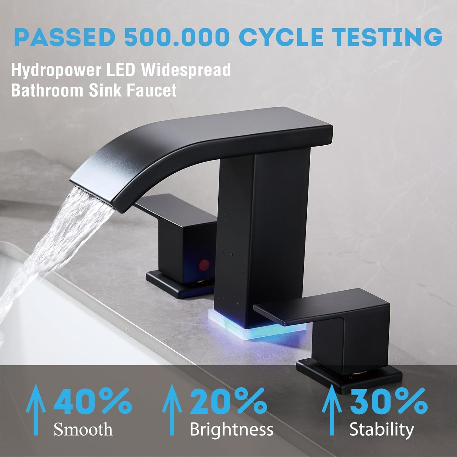 Bathroom Faucets 8 Inch Widespread Bathroom Sink Faucet Two Handles Black Bathroom Faucet 3 Hole Waterfall Vanity Sink Faucet for 3 Hole with LED Light with Pop Up Drain