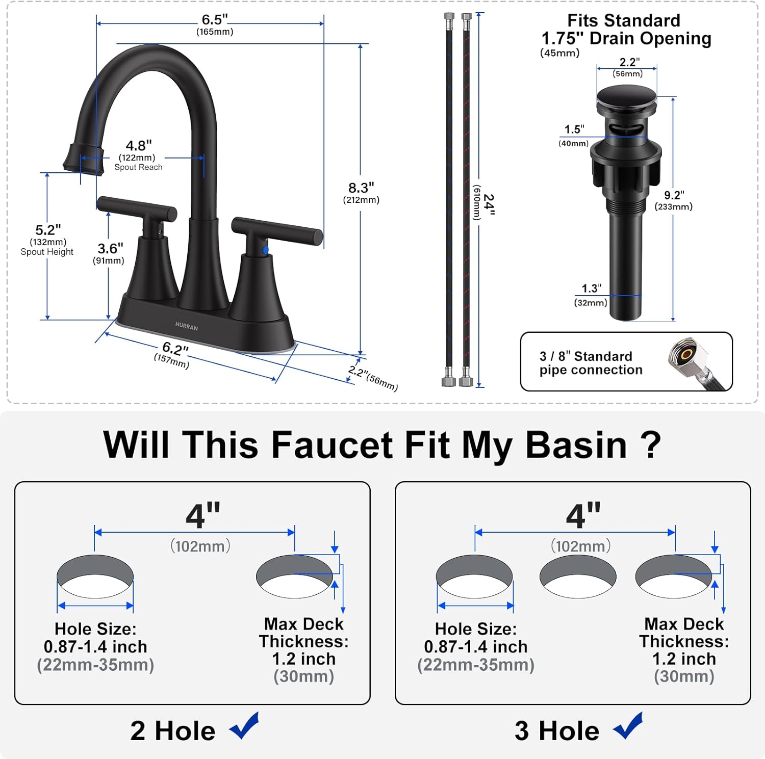 Bathroom Faucets for Sink 3 Hole, Hurran 4 inch Matte Black with Pop-up Drain and 2 Supply Hoses, Stainless Steel Lead-Free 2-Handle Centerset Faucet for Sink Vanity